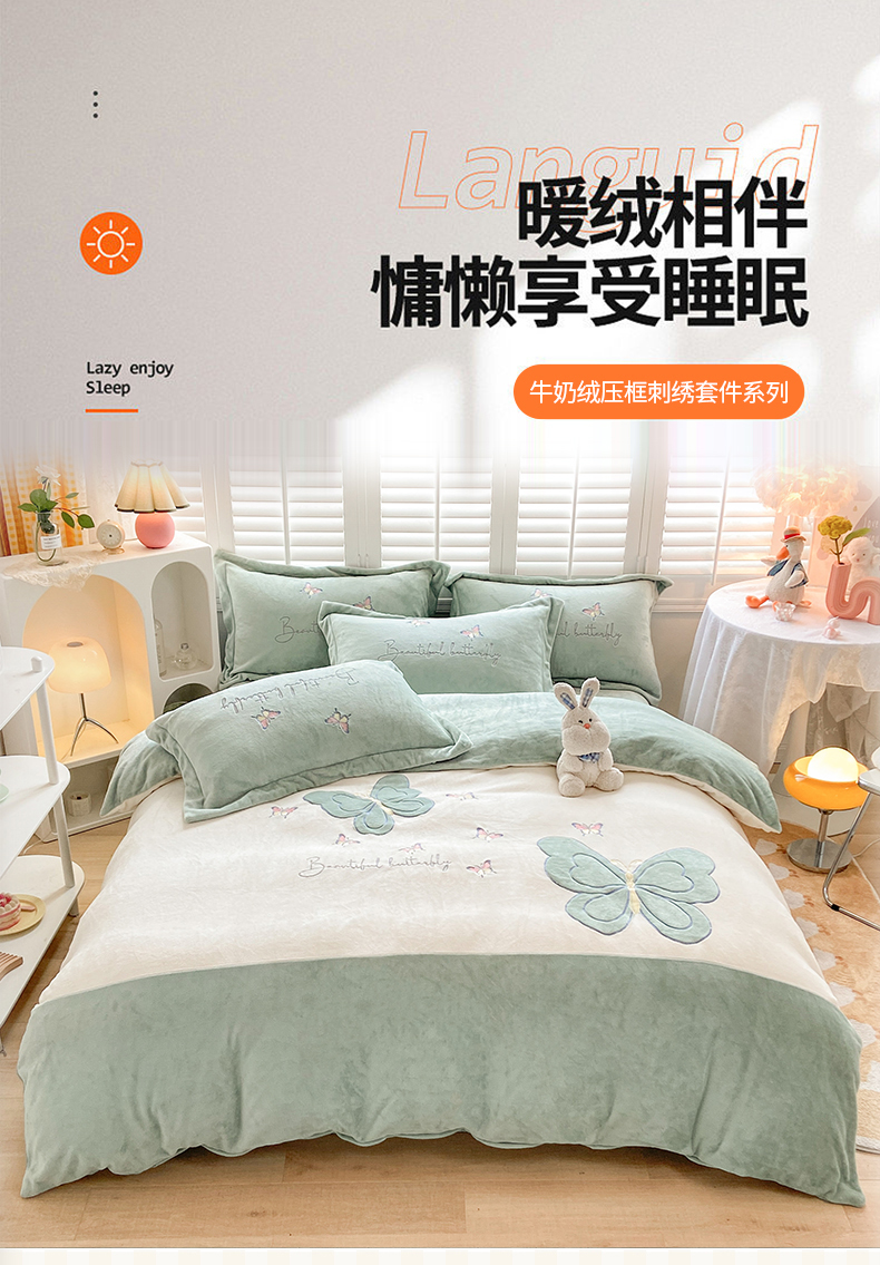 - - 2025新款A类200克牛奶绒山茶花刺绣四件套